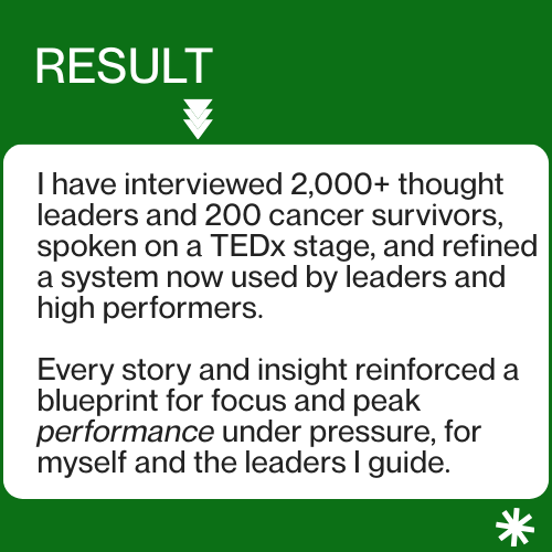 Leveraging lived experience and science-backed strategies, equipping executives to navigate uncertainty, optimize performance, and lead with clarity and unshakable confidence.