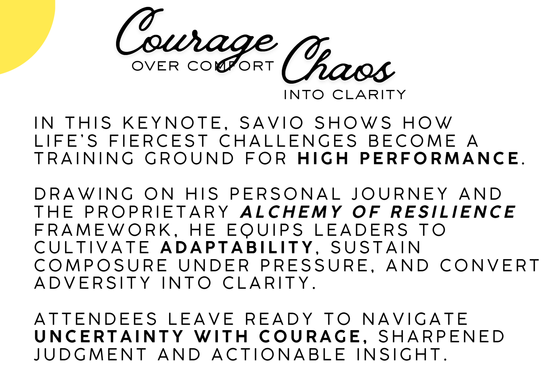 Through his signature Alchemy of Resilience framework, Savio equips leaders to turn challenge into insight, breakdowns into breakthroughs, and adversity into growth.