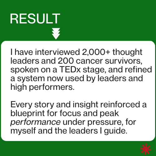 Leveraging lived experience and science-backed strategies, equipping executives to navigate uncertainty, optimize performance, and lead with clarity and unshakable confidence.