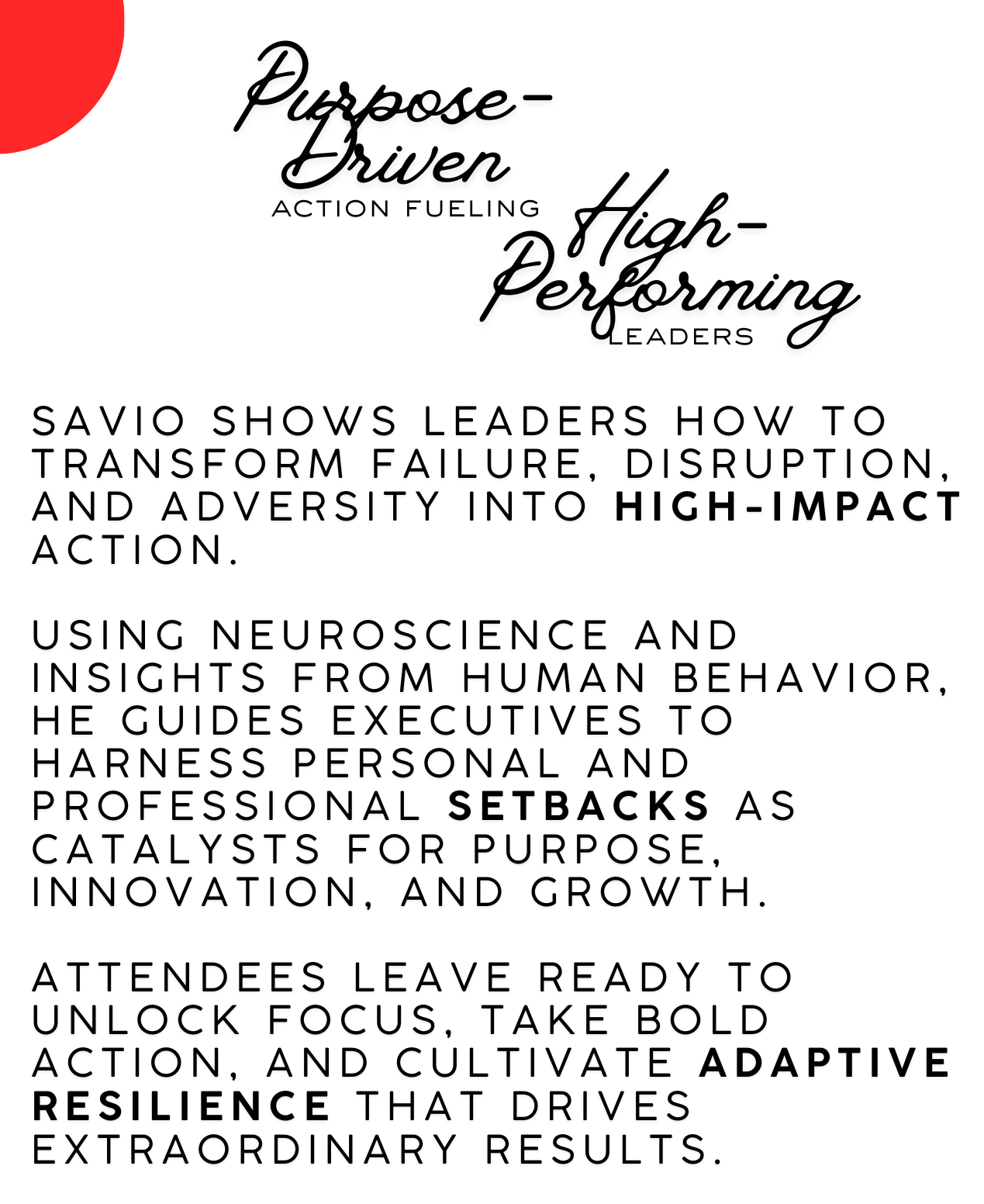 Leveraging lived experience and science-backed strategies, Savio equips executives to navigate uncertainty, optimize performance, and lead with clarity and unshakable confidence.